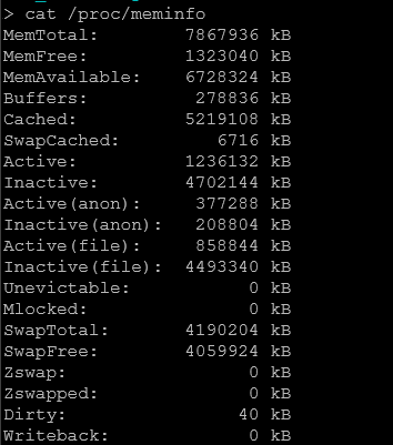 Sprawdzenie całego meminfo, które zawiera wszelkie informacje o pamieci na systemie linux