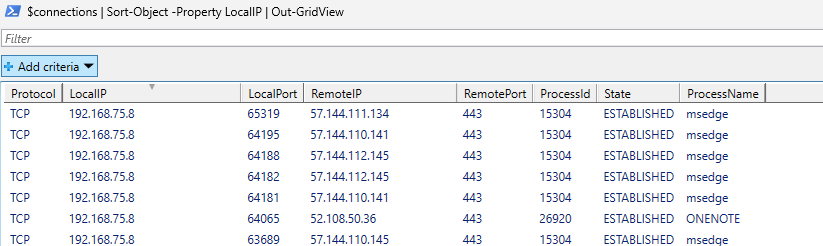 $connections | Sort-Object -Property LocalIP | Out-GridView