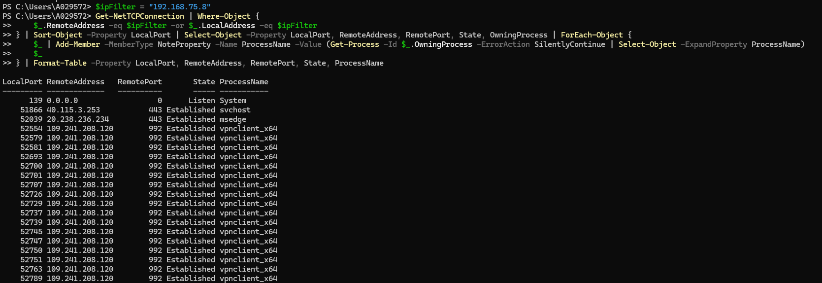$connections | Sort-Object -Property LocalIP | Format-Table -AutoSize -Property Protocol, LocalIP, LocalPort, RemoteIP, RemotePort, ProcessId, State, ProcessName