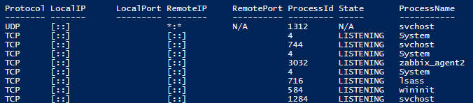 } | Sort-Object -Property LocalPort | Select-Object -Property LocalPort, RemoteAddress, RemotePort, State, OwningProcess | ForEach-Object {