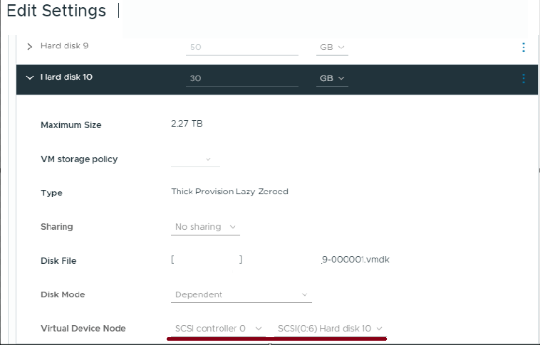 Następnie otwieramy właściwości maszyny wirtualnej w kliencie VMWare vSphere. Znajdujemy dysk, który ma taki sam numer Virtual Device Node, jak ID, które uzyskano. W naszym przykładzie jest to SCSI(0:6).