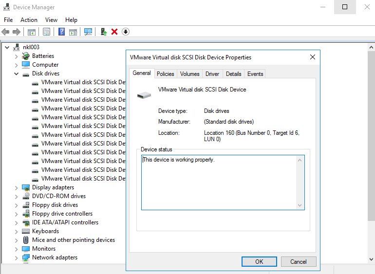 Aby uzyskać numer urządzenia SCSI, klikamy prawym przyciskiem na dysk i wybieramy Właściwości. Informacja o porcie urządzenia dla dysku wirtualnego VMWare SCSI Disk Device znajduje się w polu Lokalizacja na zakładce Ogólne.