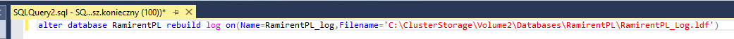 Dobrą praktyką jest zapisane najpierw do nowego pliku, a następnie zmiana nazwy oryginalnego pliku na taką z dopiskiem "_OLD". Potem należy z powrotem przełączyć bazę w tryb online i znowu offline, a następnie ponownie wykonać przebudowę logów już z taką nazwą jaka była oryginalnie.