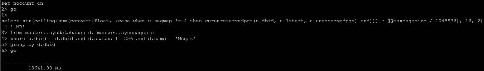 select str(ceiling(sum(convert(float, (case when u.segmap != 4 then curunreservedpgs(u.dbid, u.lstart, u.unreservedpgs) end))) * @@maxpagesize / 1048576), 16, 2) + ' MB'